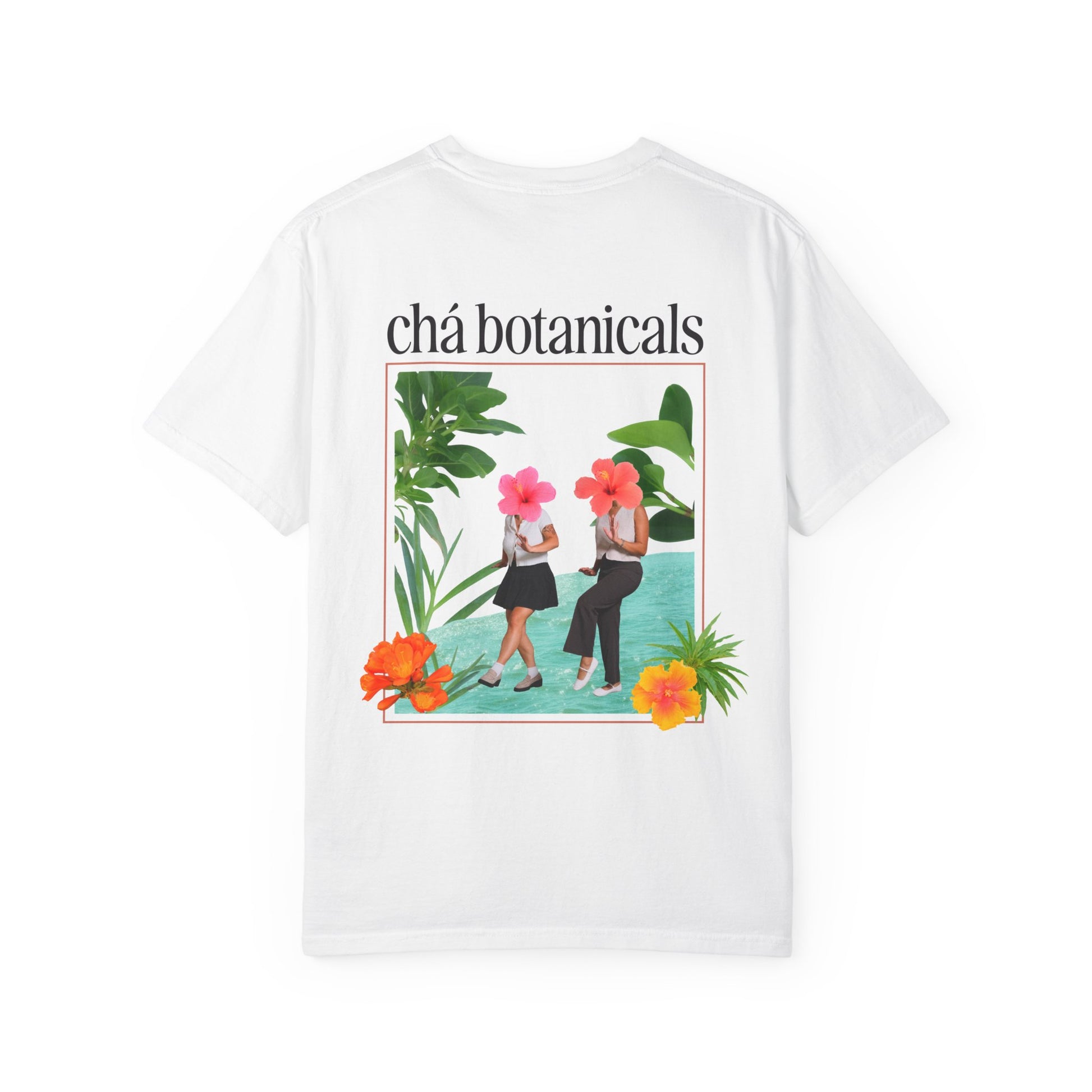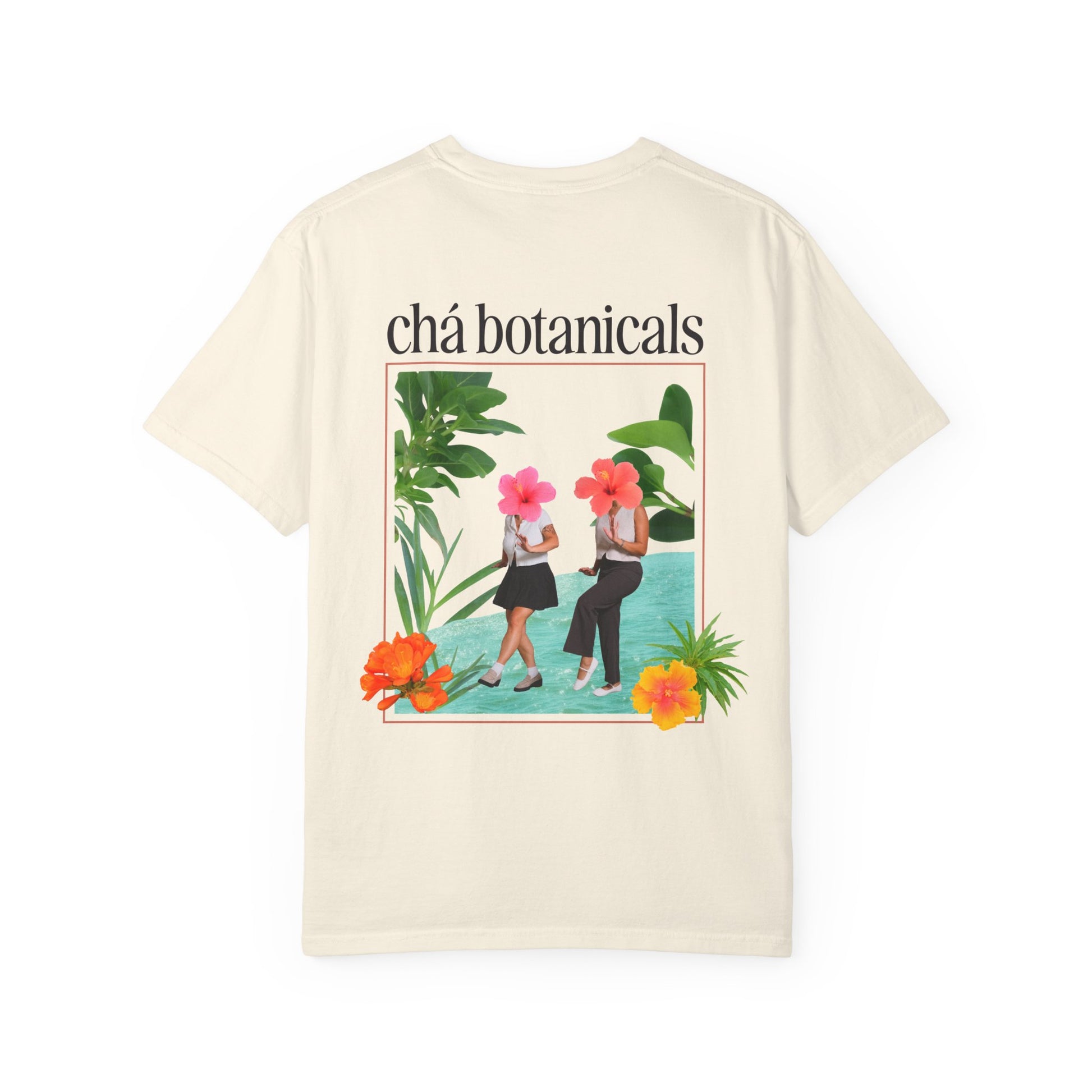 Lightweight, lived-in comfort meets sunlit botanical charm. This relaxed-fit tee feels like a slow morning on a porch — soft, broken-in, and quietly stylish. The garment-dyed cotton has a plush hand and muted color depth that ages beautifully. On the back, a framed botanical illustration shows two friends sharing tea by water, hibiscus blooms and lush foliage surrounding them. The front carries a small, elegant brand wordmark over the chest, so the design reads as a wearable summer postcard: gentle, artful, and easy to layer. Wear it when you want a calm, nature-first look that reads thoughtful rather than flashy.